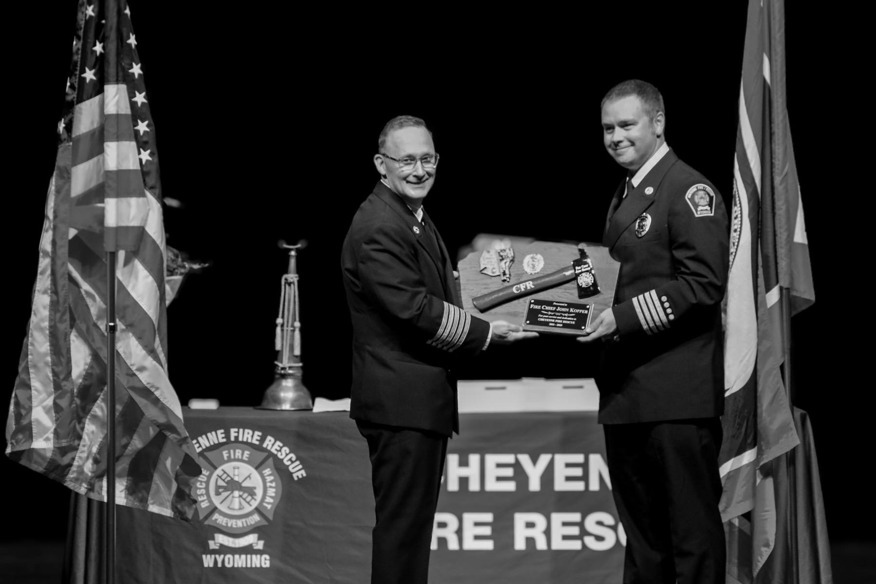 We extend our deepest gratitude to Chief John Kopper for his exceptional dedication and years of service. Chief Kopper, your commitment to our nation through your military service, and your unwavering leadership and tireless efforts within the Cheyenne community and Cheyenne Fire Rescue, have left an indelible mark. Thank you for your profound impact and for selflessly serving our community.