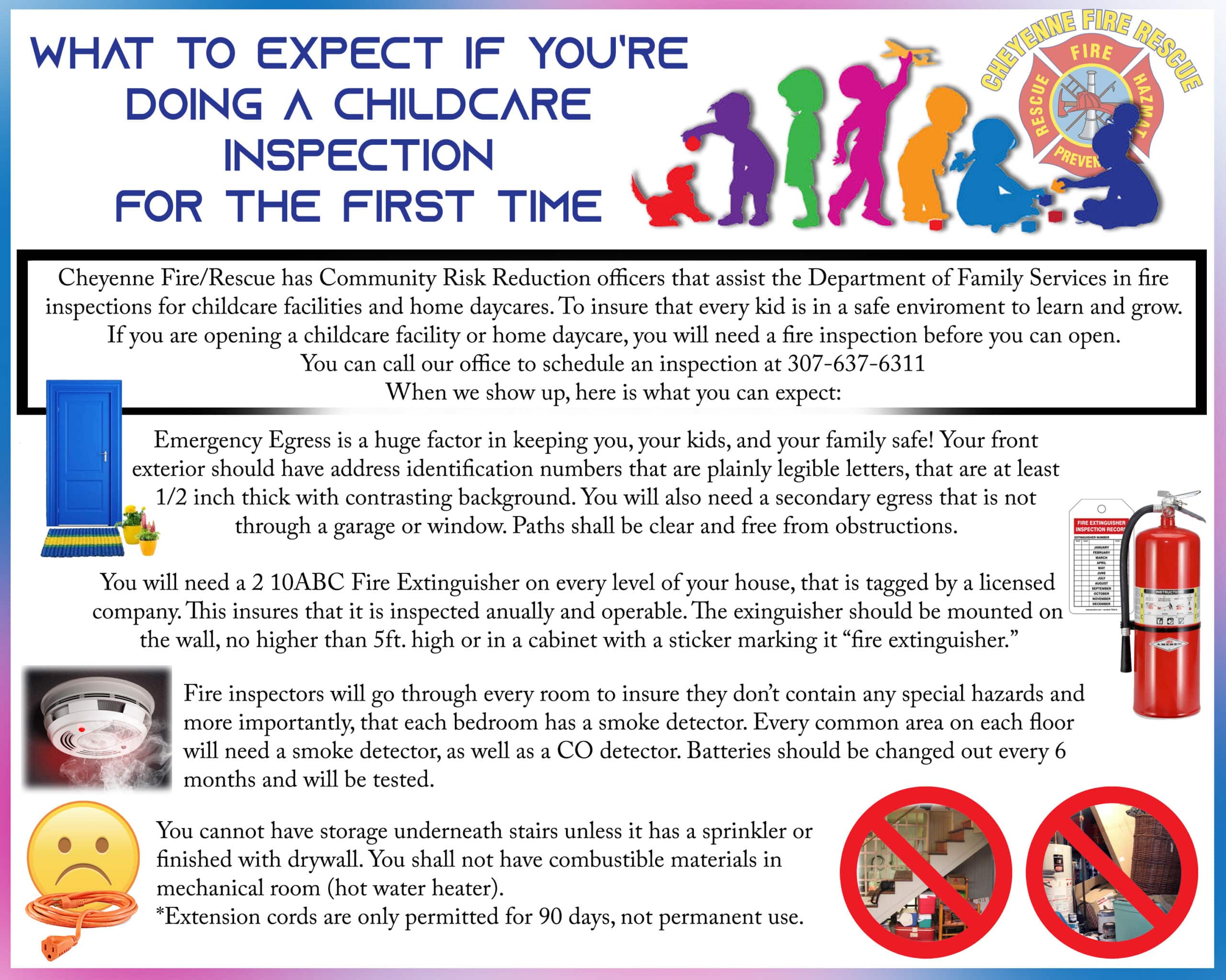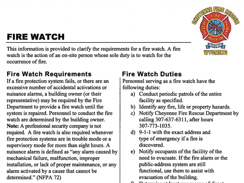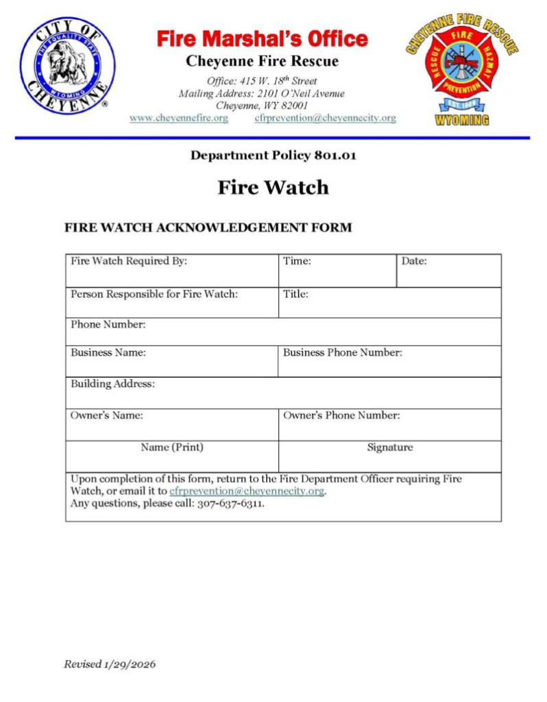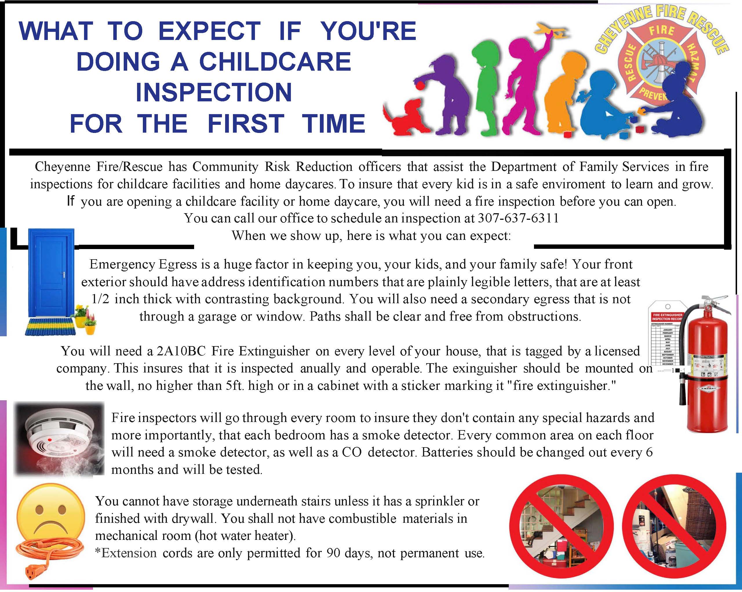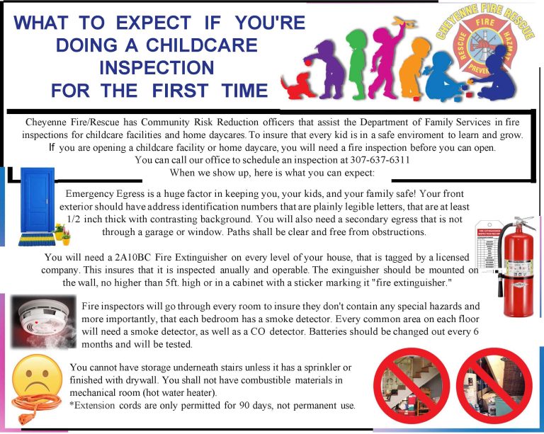 The Cheyenne Fire Rescue Inspection/Prevention division is devoted to the safety and fire education of our community. The fire inspections section conducts all building life safety inspections on new construction projects along with remodels and fire code enforcement. They also perform home inspections for respite care and daycare. The section consists of the Fire Marshal, and four nationally certified fire inspectors. Fire prevention inspections along with preplan inspections may be done at the company level with on duty fire crews under the jurisdiction of the Cheyenne Fire Marshal.